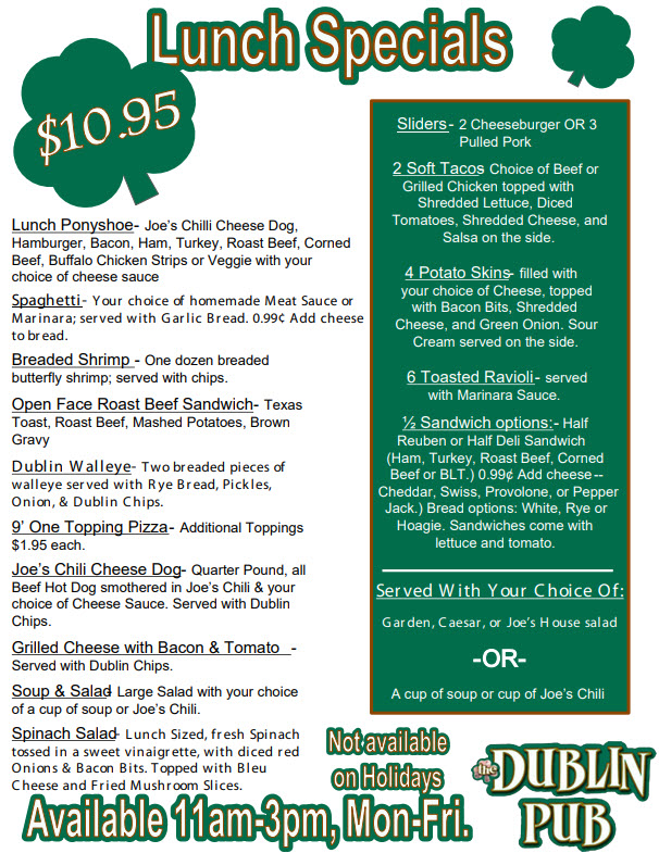 Everyday Dublin Pub’s Famous Daily Specials, Lunch Specials and Happy Hour. Your Go-to Spot for Good Times.